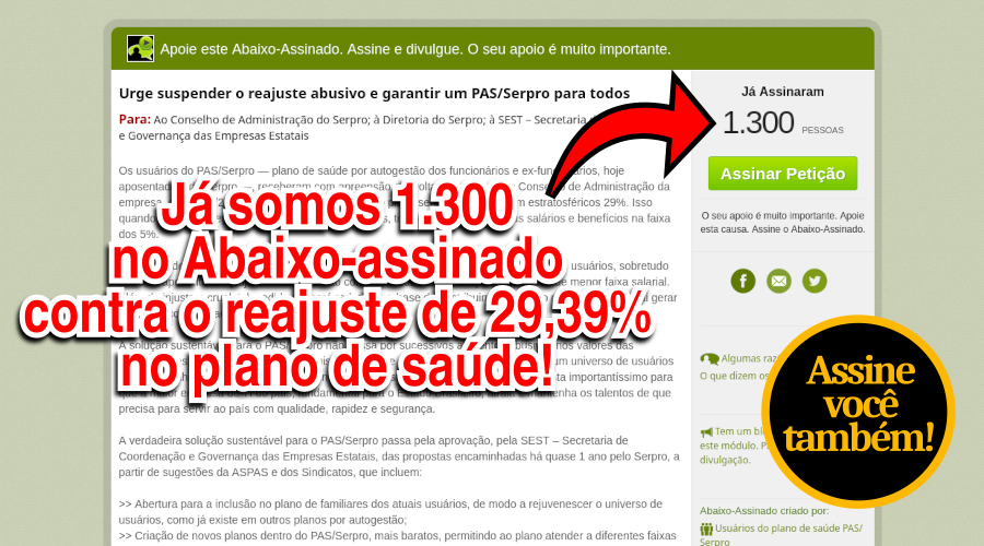 Você e seus dependentes já assinaram o Abaixo-assinado pela suspensão do reajuste de 29,39% no PAS/Serpro?