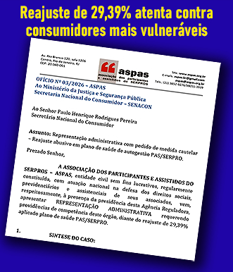 A ASPAS acaba de enviar ofício à Secretaria Nacional do Consumidor (Senacon), órgão do Ministério da Justiça, pedindo uma Medida Cautelar Administrativa para evitar um dano irreparável aos consumidores idosos, usuários do PAS/Serpro, diante do recente reajuste insano e abusivo de 29,39%.