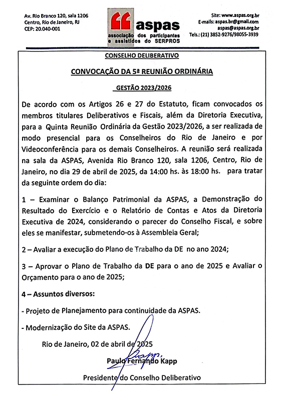 O presidente do Conselho Deliberativo da ASPAS, Paulo Kapp, assinou a Convocação para a 5ª Reunião Ordinária do Conselho, com a participação do Conselho Fiscal e da Diretoria Executiva, que será realizada no dia 29 deste mês. Além dos temas obrigatórios sobre finanças e plano de trabalho da Associação, essa reunião tratará também de temas como a modernização do site da entidade na internet e do planejamento para a ASPAS do futuro.