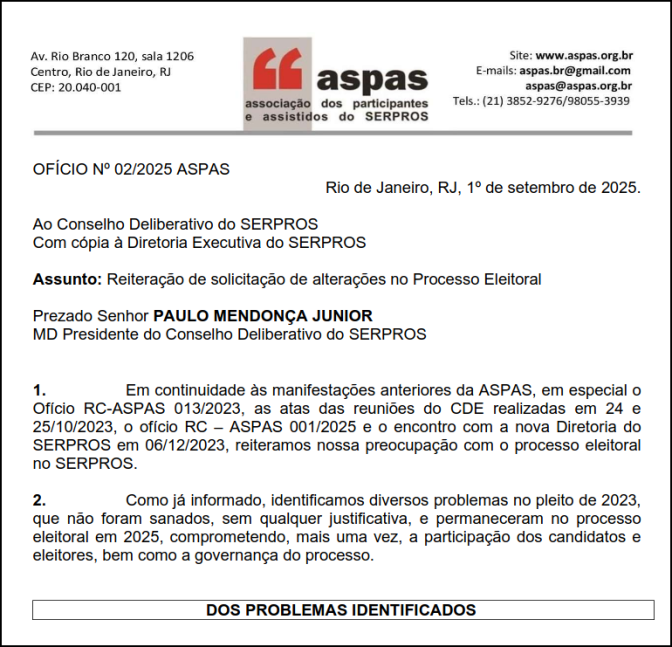 A ASPAS identifica dez problemas no processo eleitoral e sugere nove medidas para saná-los. O ofício deixa claro que "a ASPAS não pretende senão contribuir para o aperfeiçoamento do processo eleitoral do SERPROS", de modo que as próximas eleições se realizem com maior facilidade, segurança eleitoral e jurídica, participação democrática com mais candidatos e votantes e, finalmente, respeito às normas estatutárias e regulamentares.