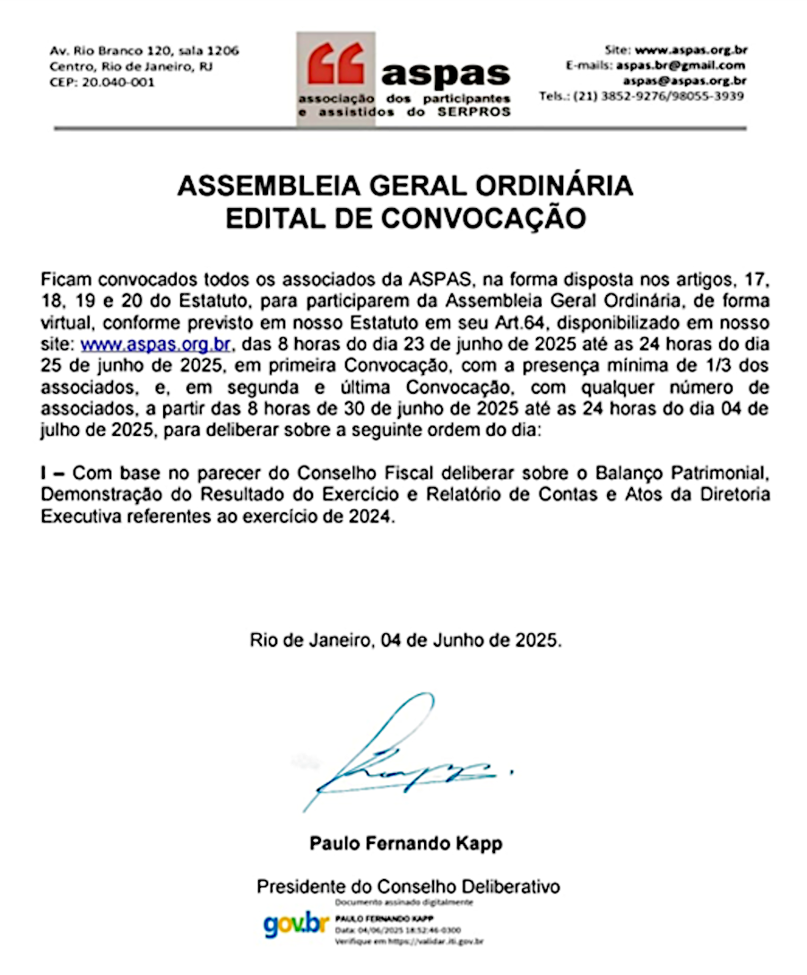 A Assembleia está votando a prestação de contas referente a 2024. Os associados devem acessar o site da ASPAS para participar: www.aspas.org.br