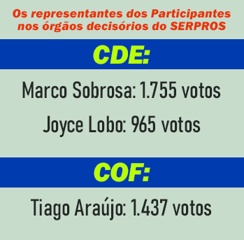 Marco Sobrosa, com 1.755 votos, e Joyce Lobo, com 965 votos, foram os dois conselheiros deliberativos eleitos pelos participantes nas eleições deste ano no SERPROS. Na primeira suplência do CDE ficou Orlando Orofino, com 788 votos. Os três jamais fizeram parte dos Conselhos do Fundo, o que demonstra a opção dos participantes por uma saudável renovação dos quadros dirigentes do SERPROS.