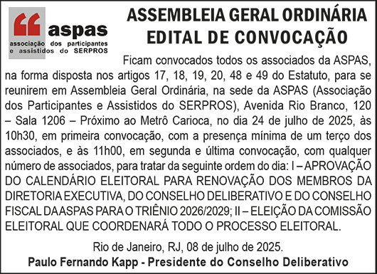O Presidente do Conselho Deliberativo da ASPAS, Paulo Fernando Kapp, assina o edital de convocação da Assembleia Geral Ordinária (AGO) que dará início ao processo eleitoral em nossa Associação. A Assembleia, que acontece no próximo dia 24 de julho, 5ª feira, pela manhã, na sede da ASPAS, definirá o calendário eleitoral e elegerá a Comissão Eleitoral que vai coordenar todo o processo.